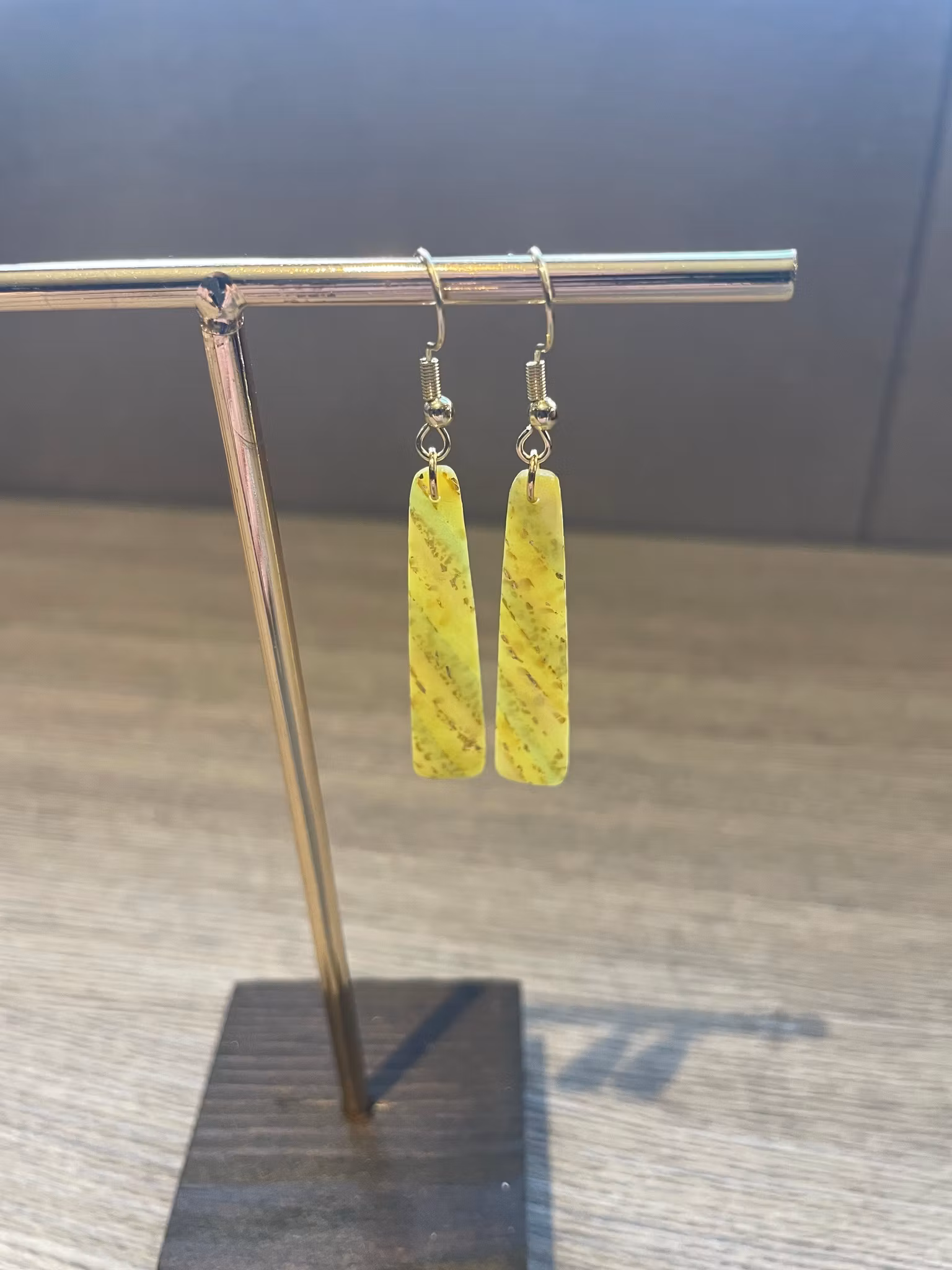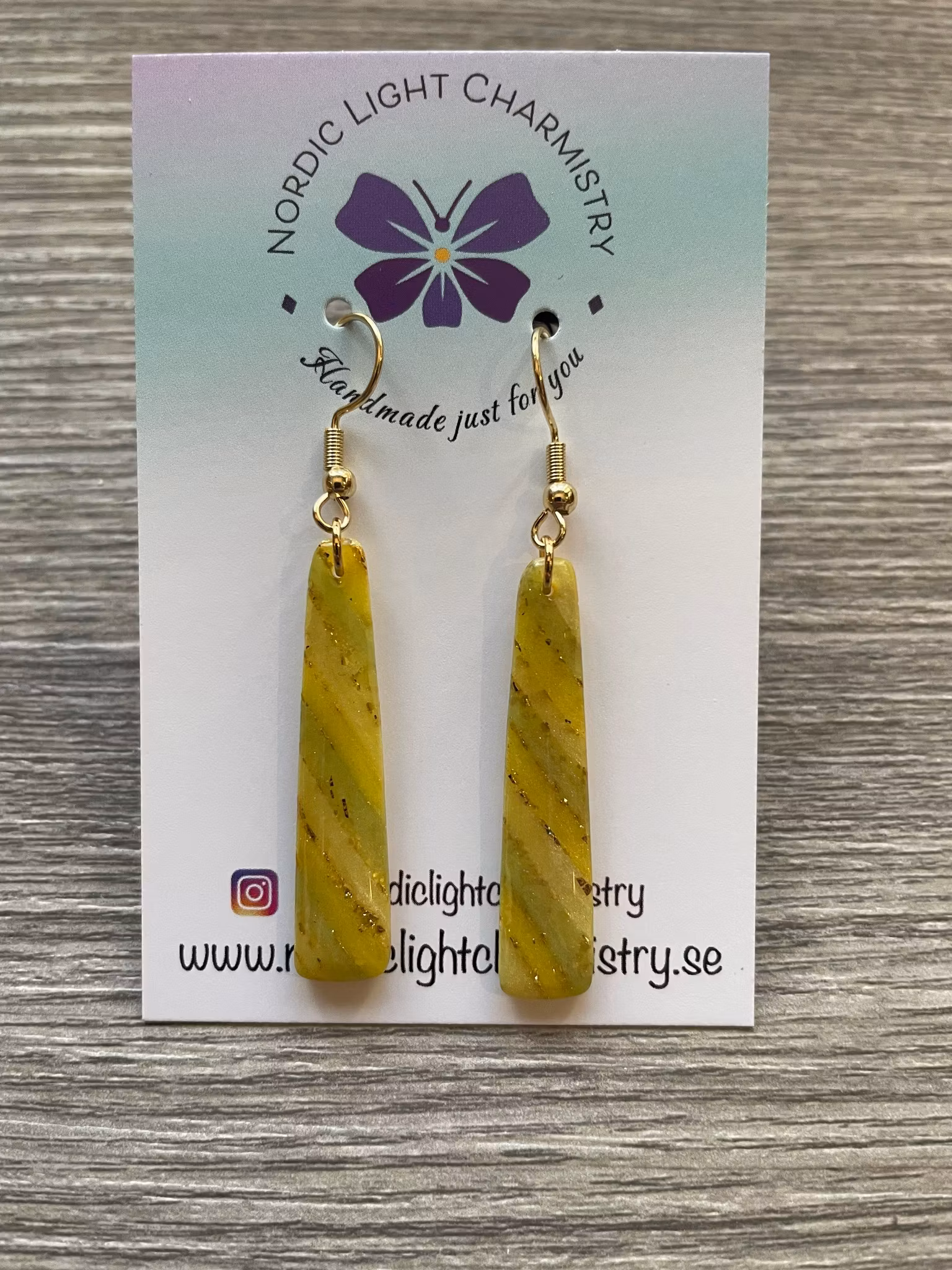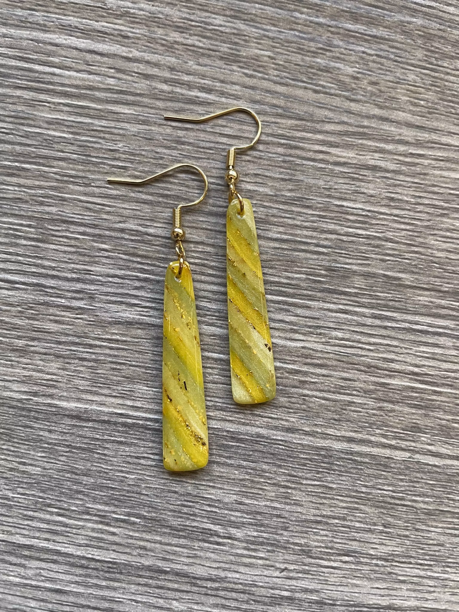 Handgjorda avlånga örhängen av polymerlera i gula och gröna nyanser med inlägg av guldstänk och ett blankt överdrag av resin, hela örhängets längd inkl. öronkrok är 5,8 cm. Öronkroken är gjort av guldpläterad kirurgiskt stål.