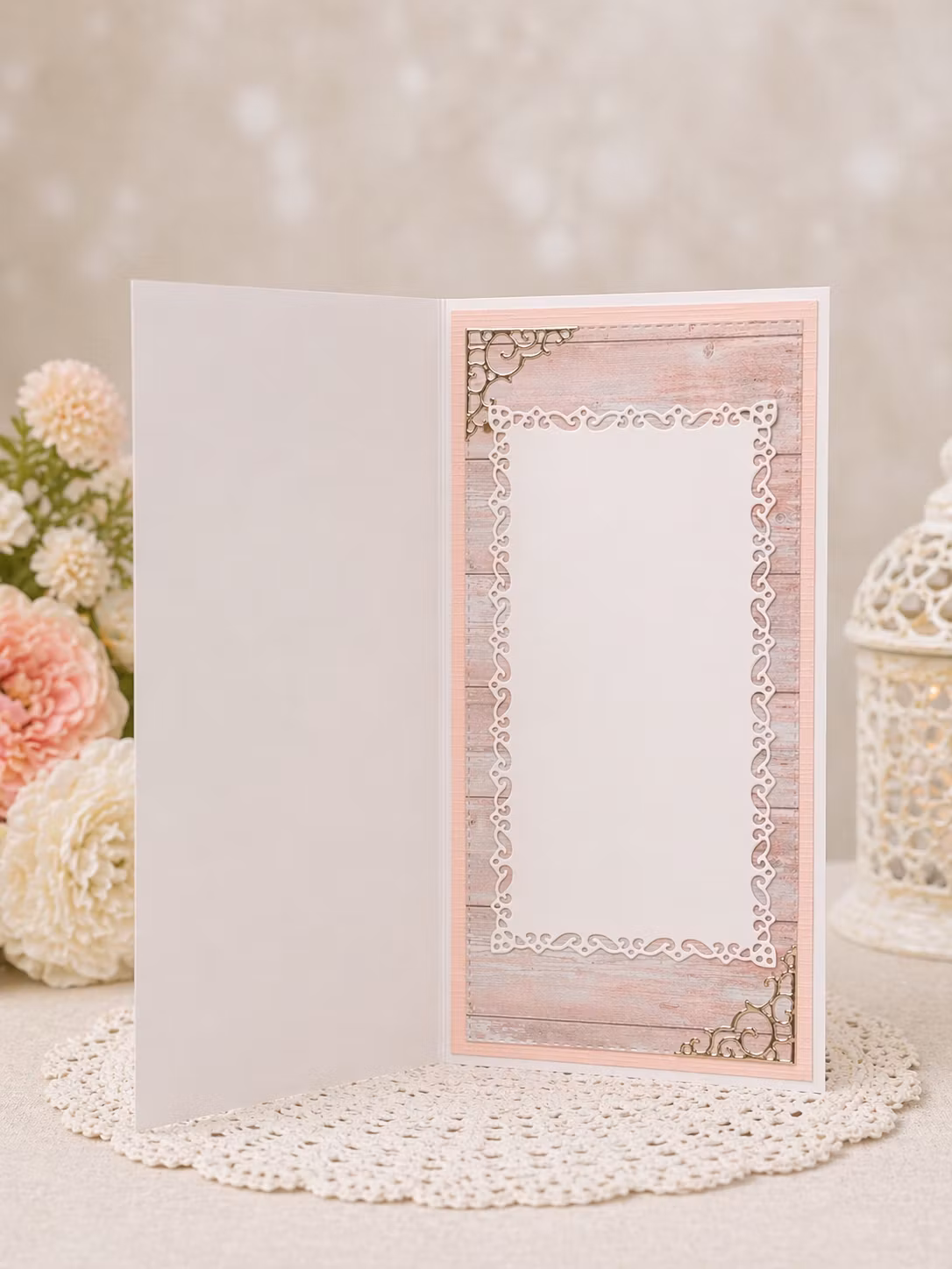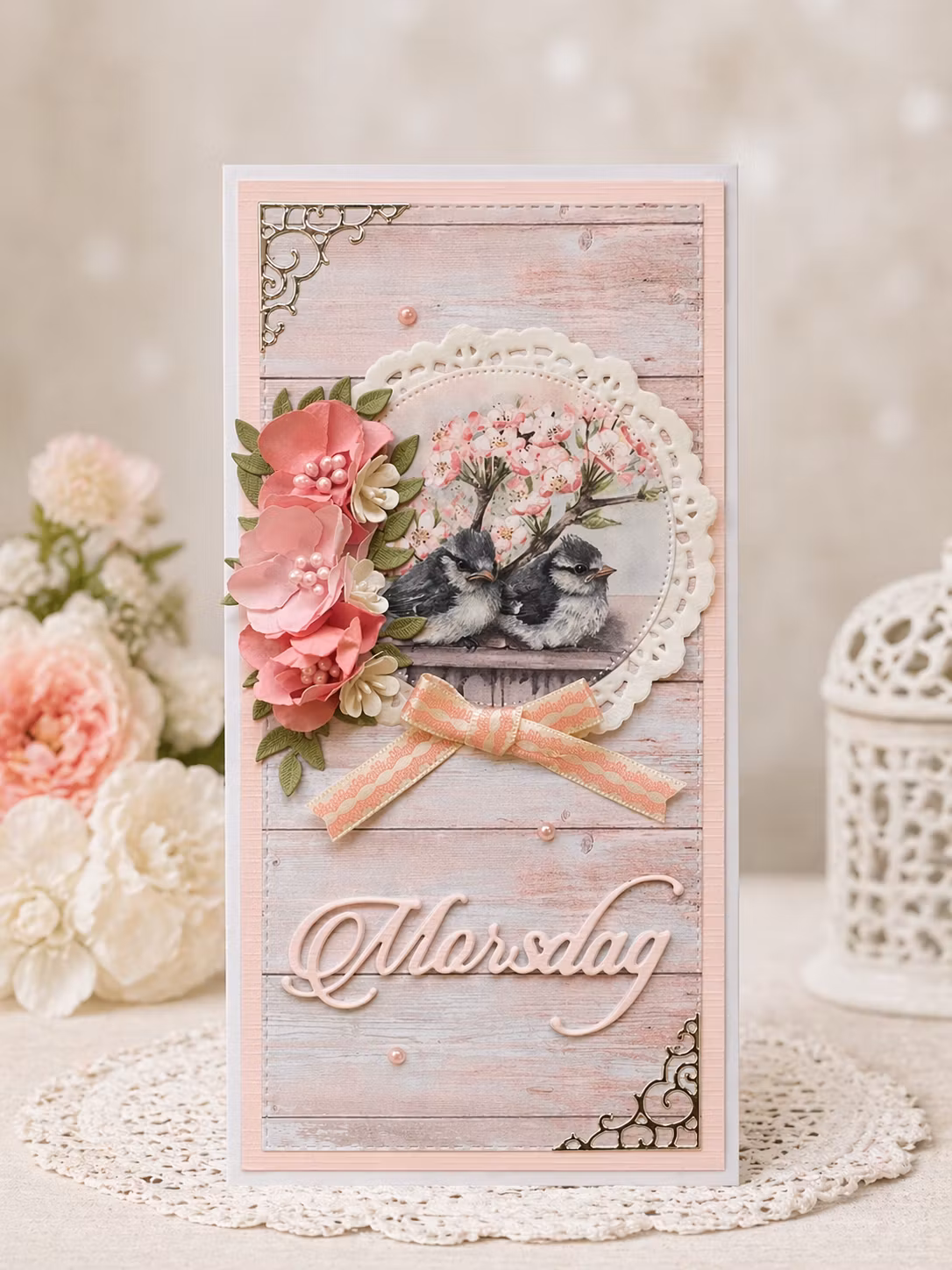 Handgjort kort perfekt till Mamma på mors dag i slimline format (10x21 cm). Kortet går i rosa och gråa nyanser med romantiska detaljer så som blommor och spets. På insidan har kortet gott om plats för att skriva en hälsning. Kortet levereras med tillhörande vitt kuvert och en skyddande cellofanpåse.