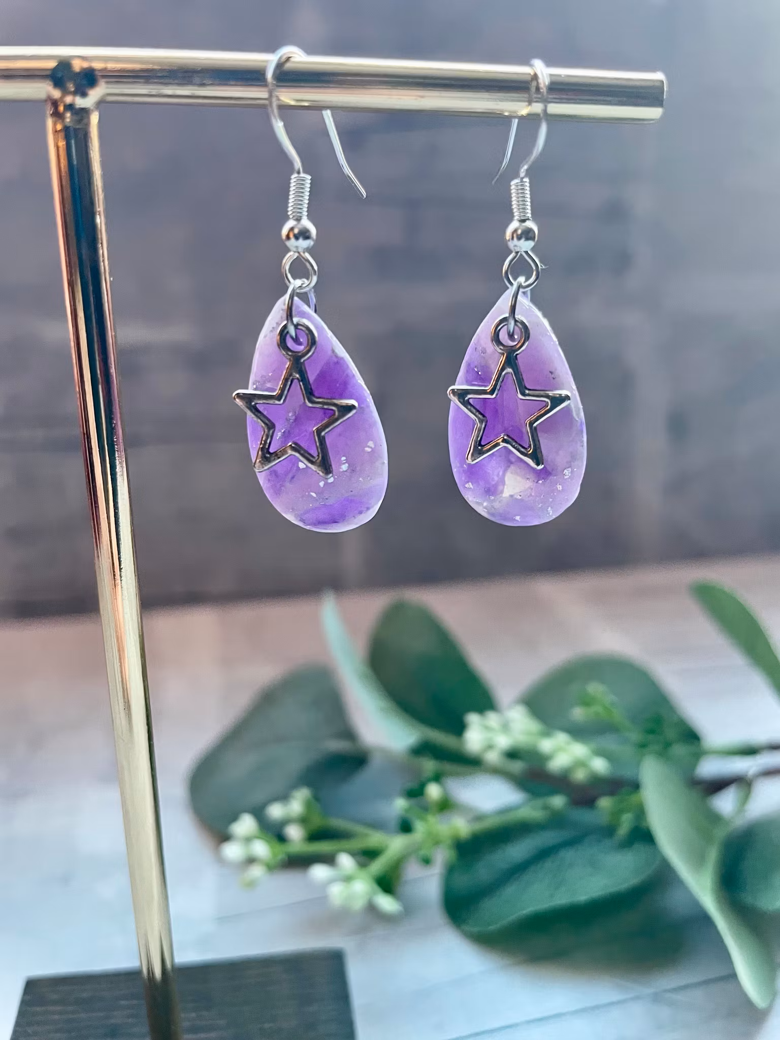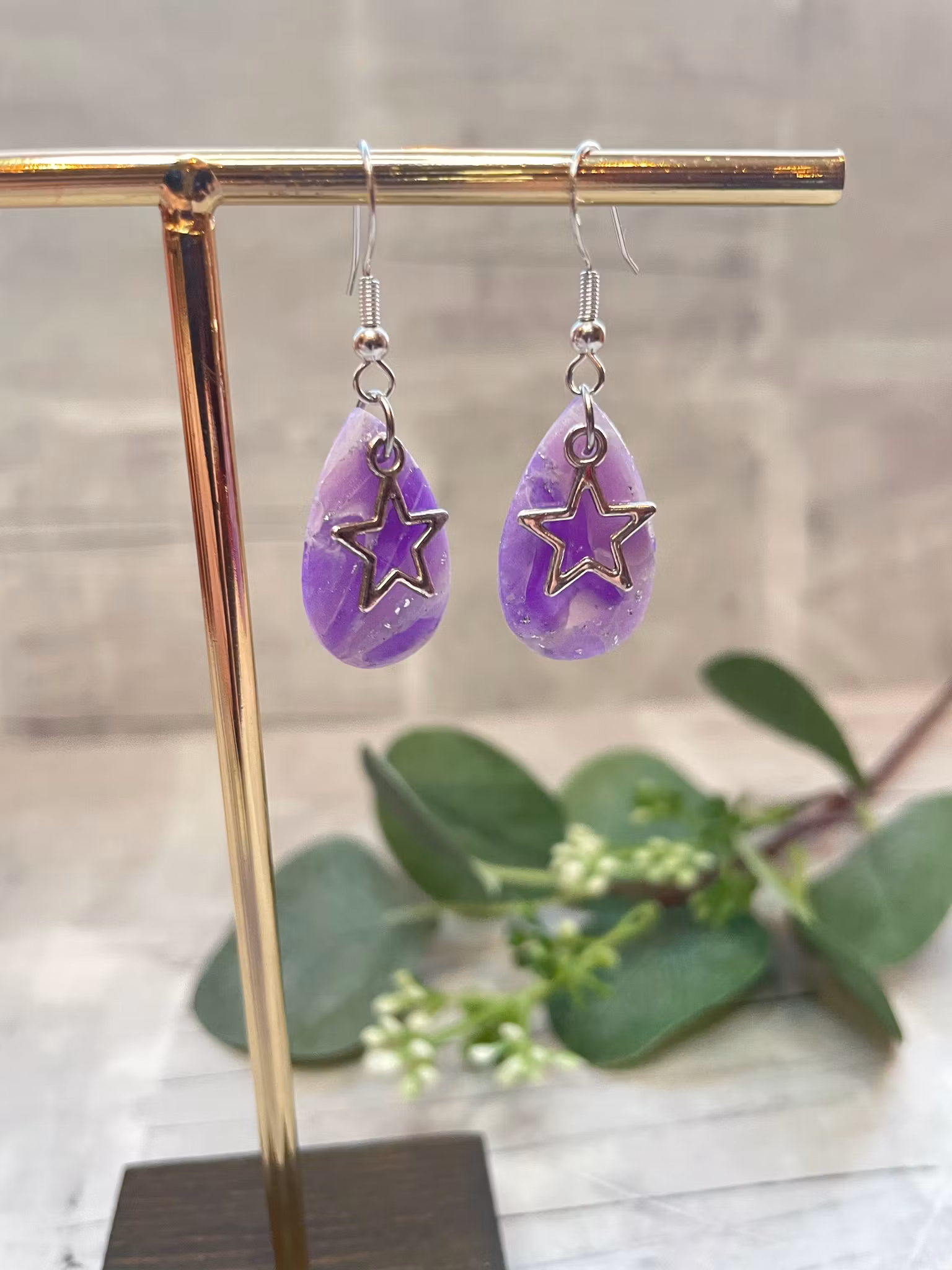 Lila droppe av marmorerad polymerlera. Droppen är 2,5 x 1,4 cm och totala längden på örhänget är ca 4,5 cm med krok. Kroken är av Sterling Silver 925 och resterande metall är kirurgiskt stål.