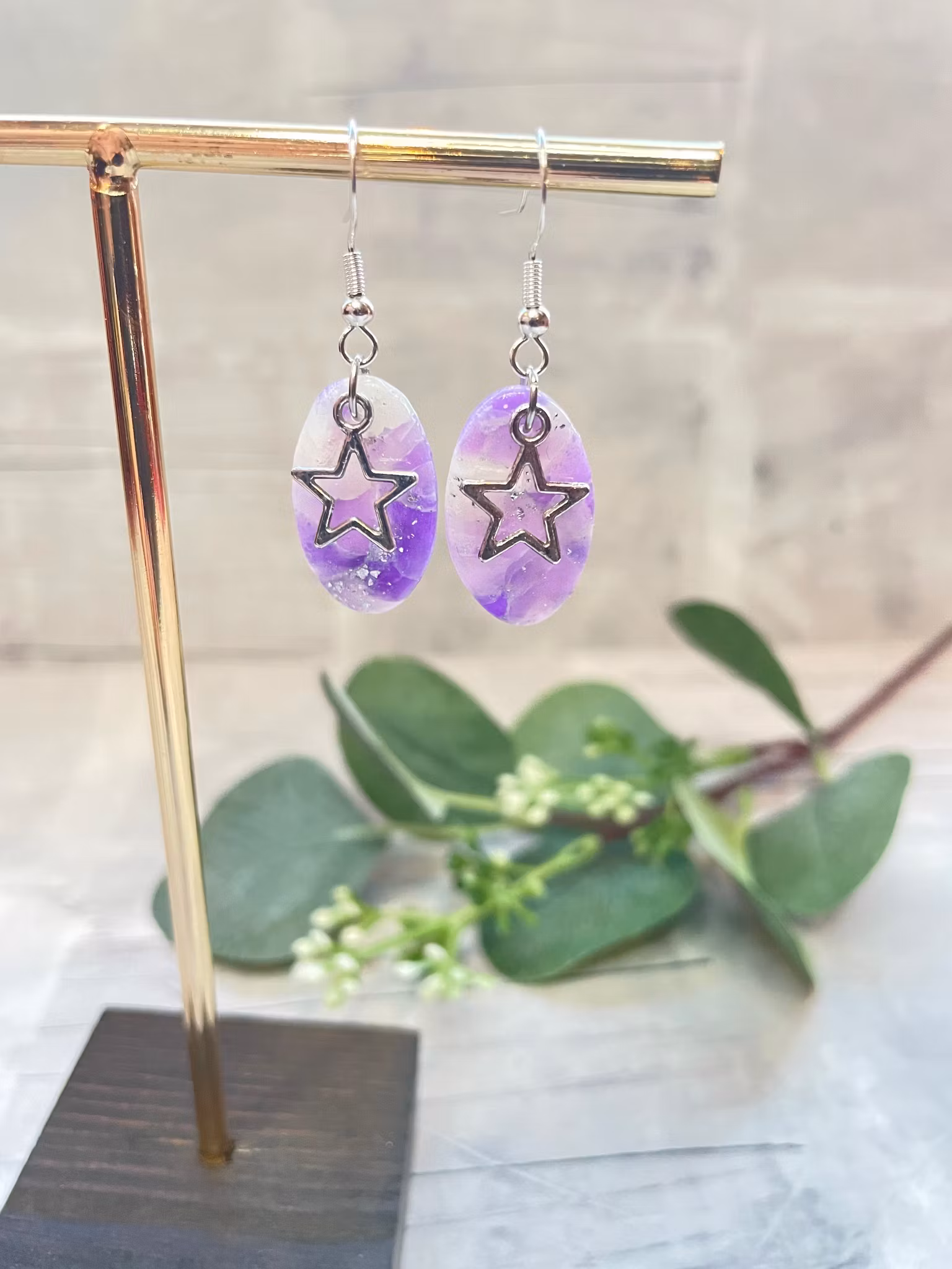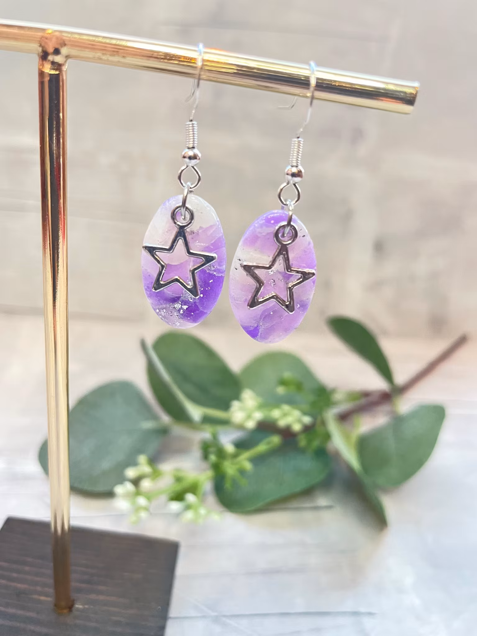 Handgjorda örhängen -Lila oval med stjärna