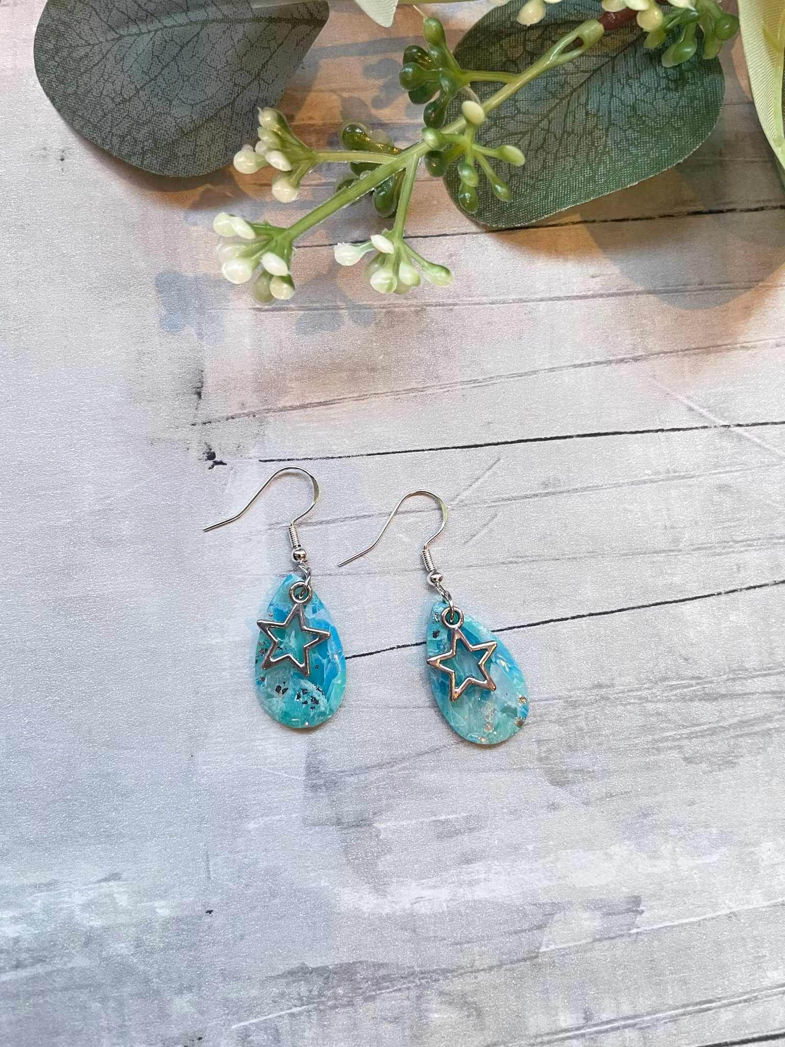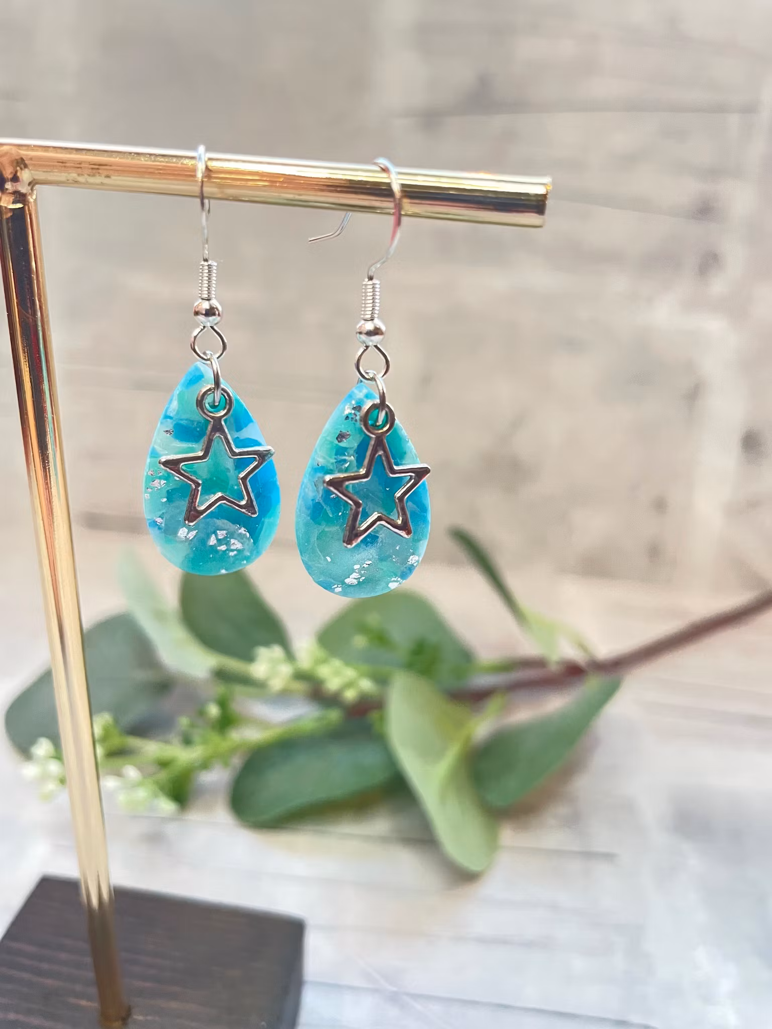Turkos droppe av marmorerad polymerlera. Droppen är 2,5 x 1,4 cm och totala längden på örhänget är ca 4,5 cm med krok. Kroken är av 925 Sterling Silver och resterande metall är kirurgiskt stål.